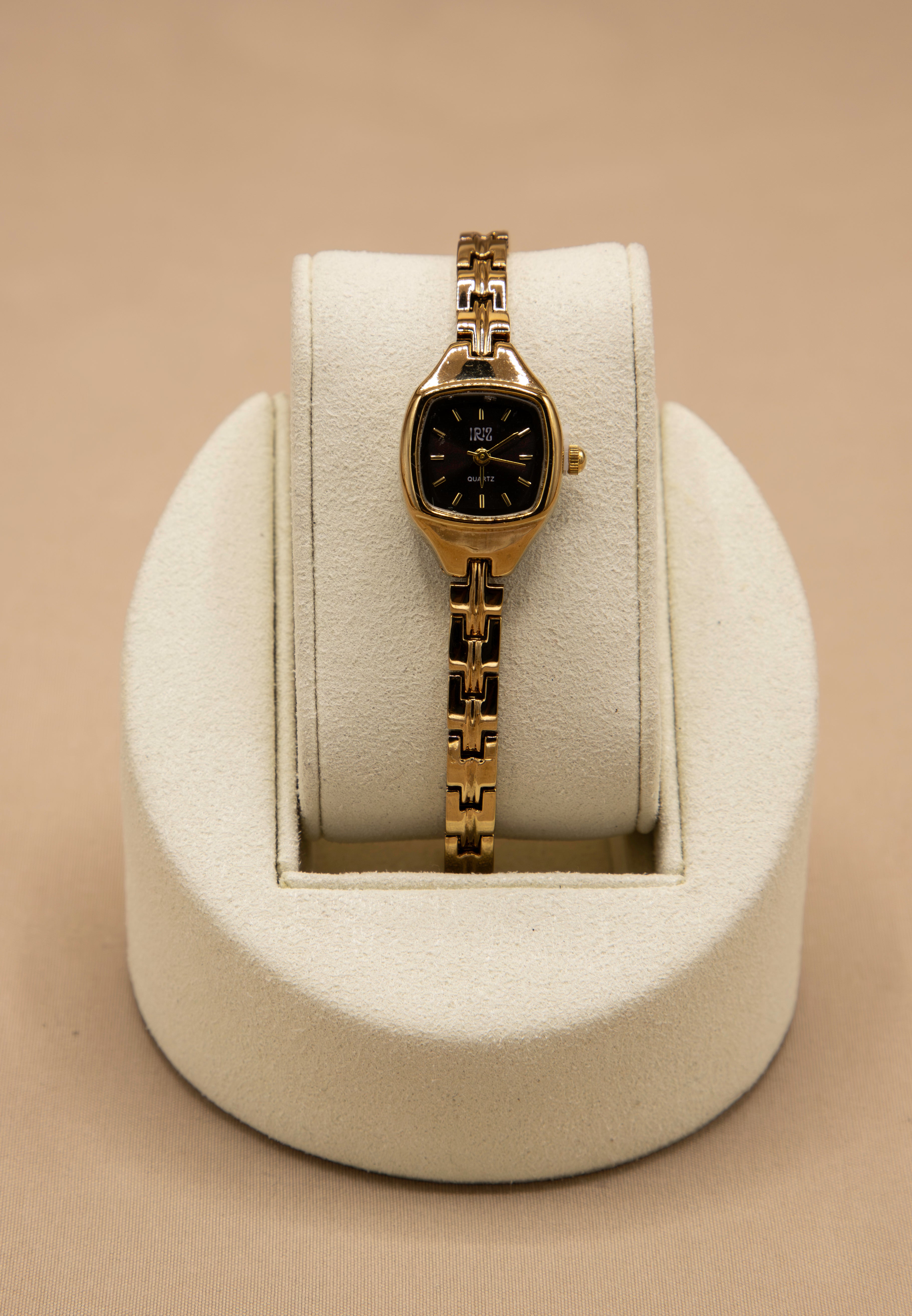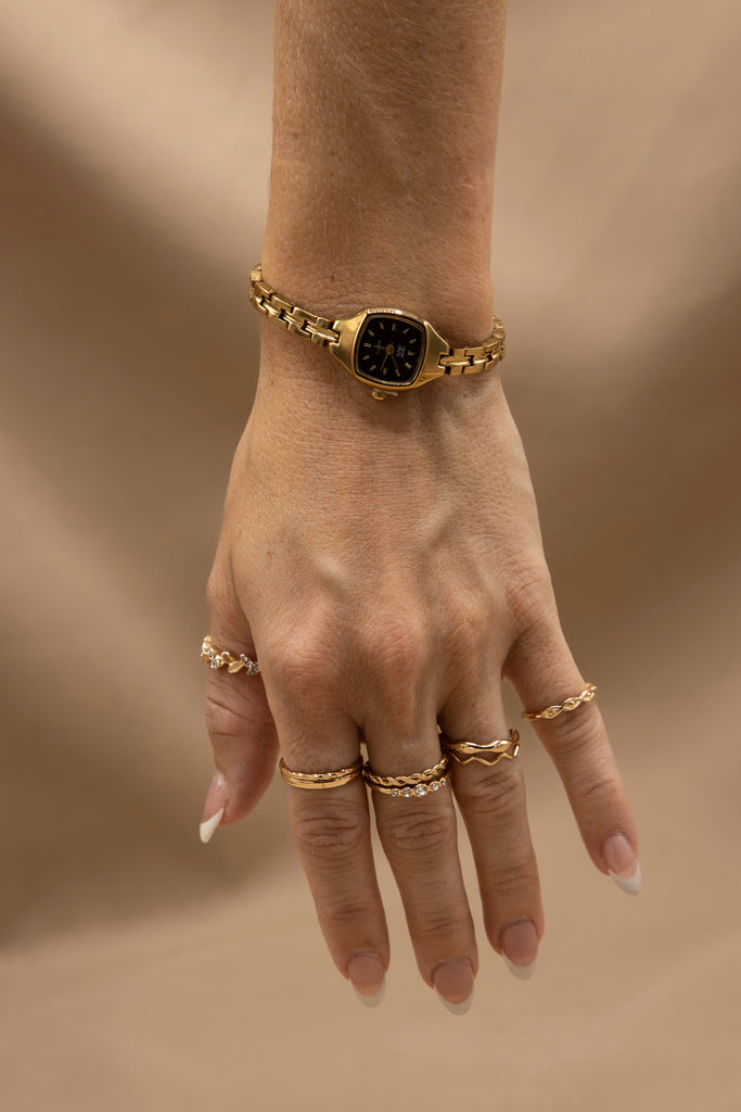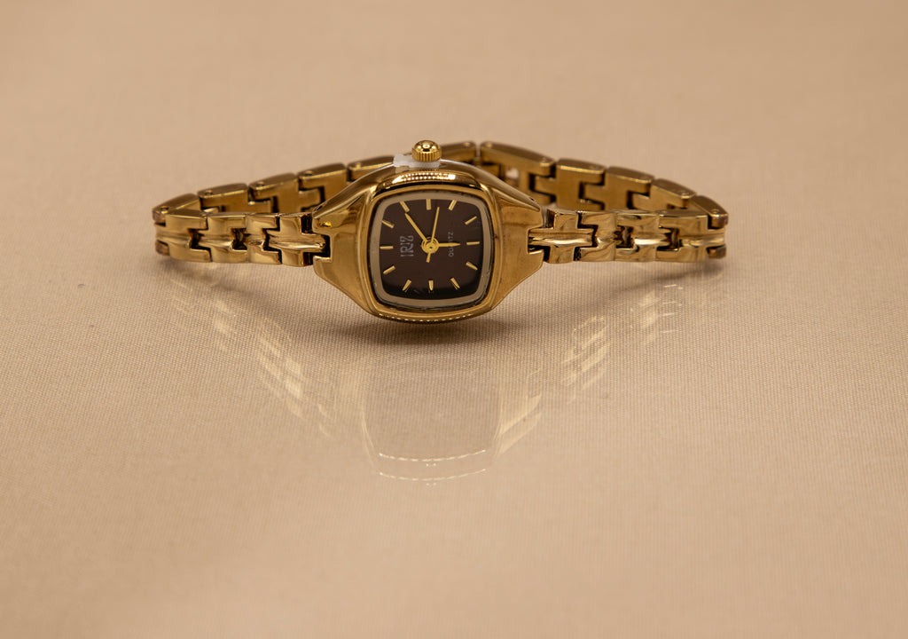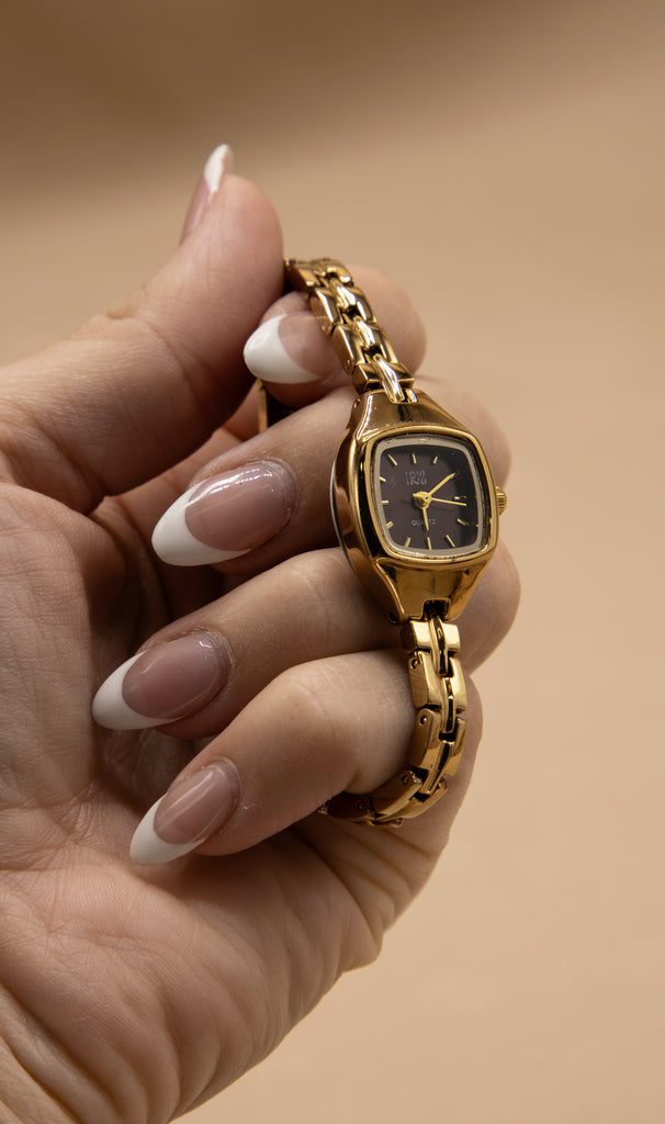 The London Burgundy is a refined statement of vintage luxury. Designed in gold stainless steel with advanced IP plating, this women’s watch is resistant to tarnish and crafted to last. Its distinctive square case frames a bold burgundy dial accented with golden markers, while a slim link bracelet adds the feel of fine jewelry to its enduring build.